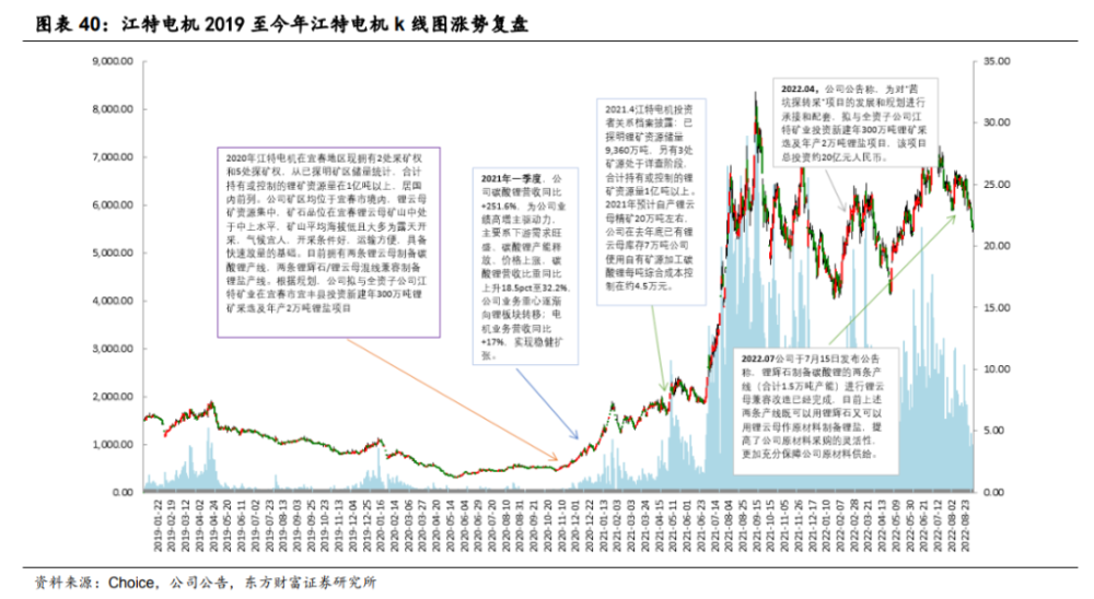 江特电机对外主要销售产品为电池级、准电池级、工业级碳酸锂,主要销售对象为下游头部或行业知名企业,其股价主升浪和碳酸锂价格上涨行情息息相关。