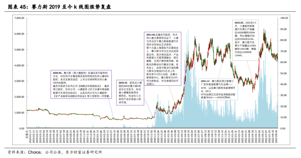 赛力斯作为一家以新能源汽车为核心业务的科技制造企业,业务涉及新能源汽车及核心三电、传统汽车及核心部件总成的研发、制造、销售及服务,主要产品覆盖新能源车和传统车。乘新能源车快速增长浪潮,并且协同华为快速转型,推动公司股价2019年至今最大涨幅达到了12.5倍。