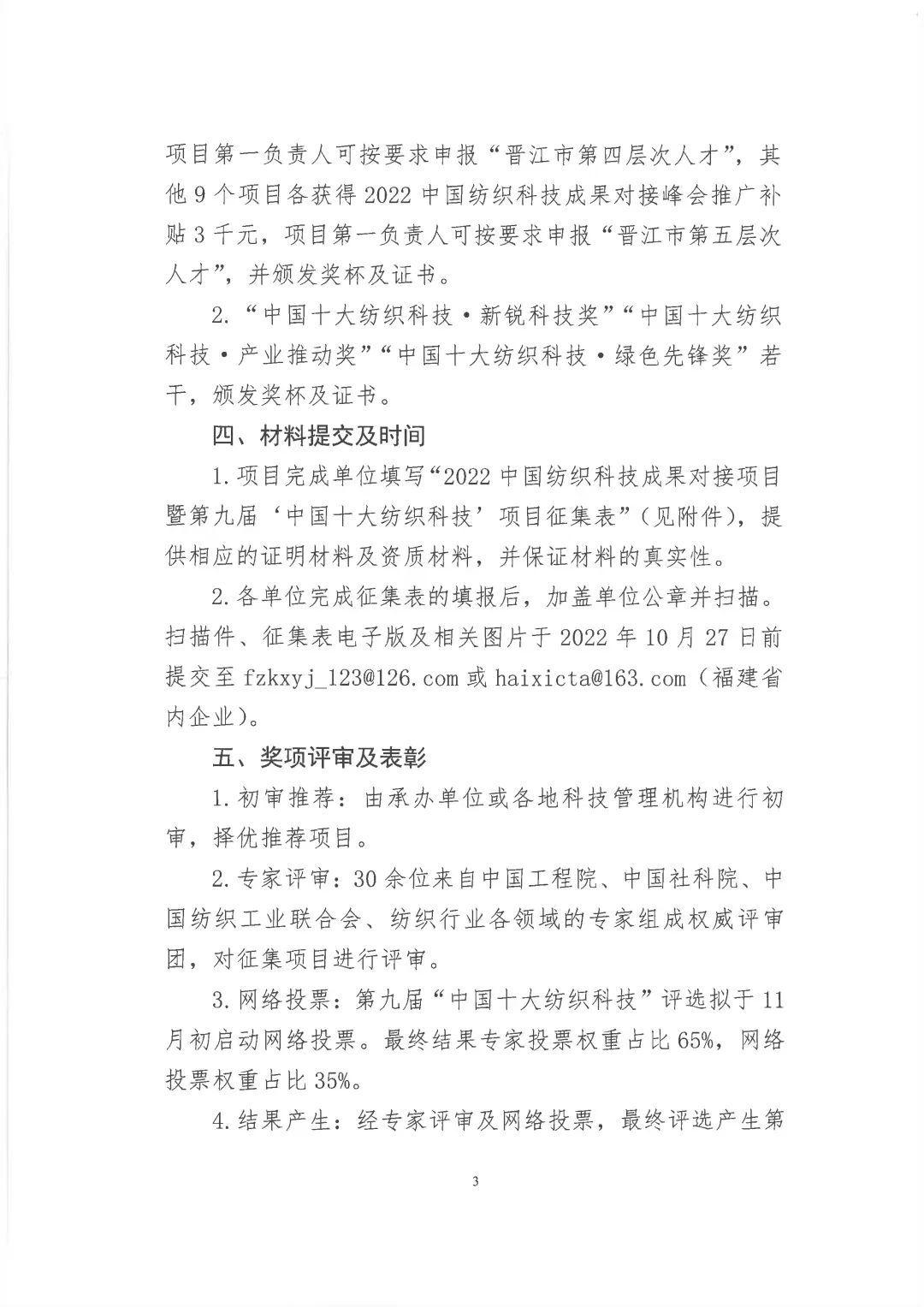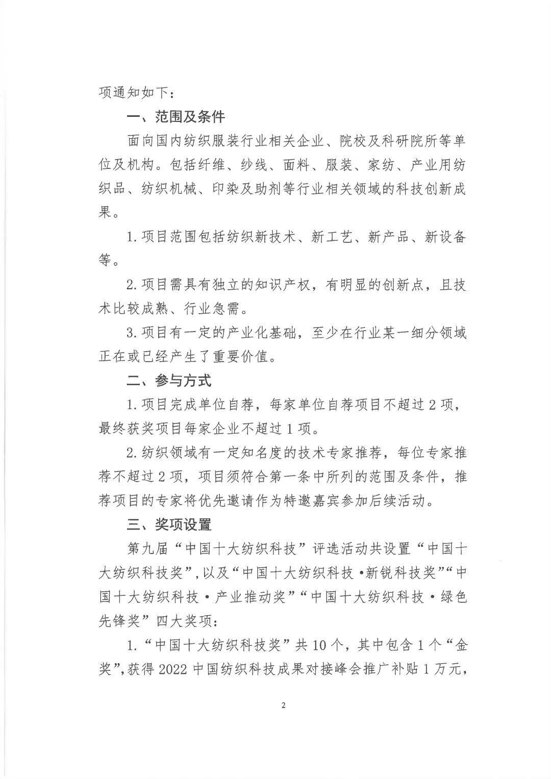 2022年是党的二十大召开之年,实施“十四五”规划承上启下之年,是立足新发展阶段、全面落实“十四五”规划、推动高质量发展的改革创新年。为进一步贯彻落实《纺织行业“十四五”发展纲要》,鼓励全行业注重科技创新,促进科技成果更好地转化落地,通用技术中国纺织科学研究院有限公司联合泉州市发展和改革委员会、泉州市科学技术局、泉州市工业和信息化局,拟举办2022中国纺织科技成果对接峰会暨第九届“中国十大纺织科技”评选活动,活动由《纺织科学研究》杂志与中国纺织科学研究院海西分院承办。