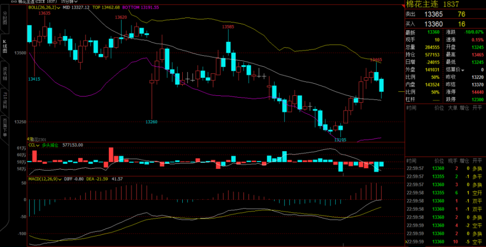 9月29日,郑棉减仓反弹,CF2301合约开盘价13245元/吨,随后一路震荡上行,盘终上涨25点报收于13395元/吨。新棉陆续开秤,籽棉价格与棉农预期有差距,交售量较少,多数棉花加工厂计划国庆节后开秤,下游棉纱交投氛围走弱,纺企随用随买,成品出库速度放缓,预计节前期棉继续低位震荡。