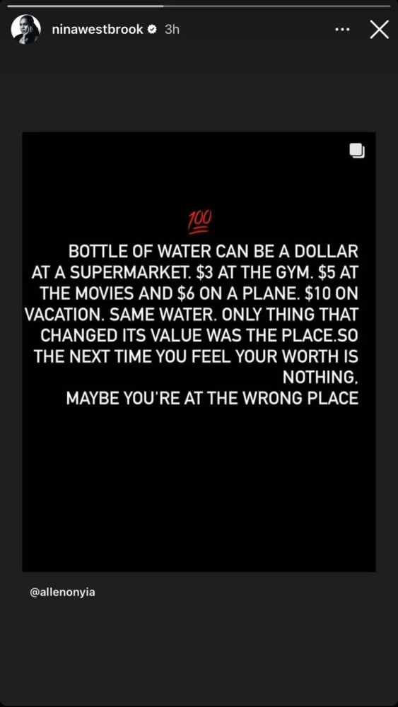 11、威少妻子暗示交易。威少的妻子妮娜更新社媒,转发一段格言:在超市,一瓶水可以卖到一美元。在健身房卖3美元,在电影院卖5美元,在飞机上卖6美元。在度假村卖10美元。这是同样的水。唯一改变它价值的因素就是位置。所以下次当你觉得你的价值是一文不值的时候,也许你来错地方了。